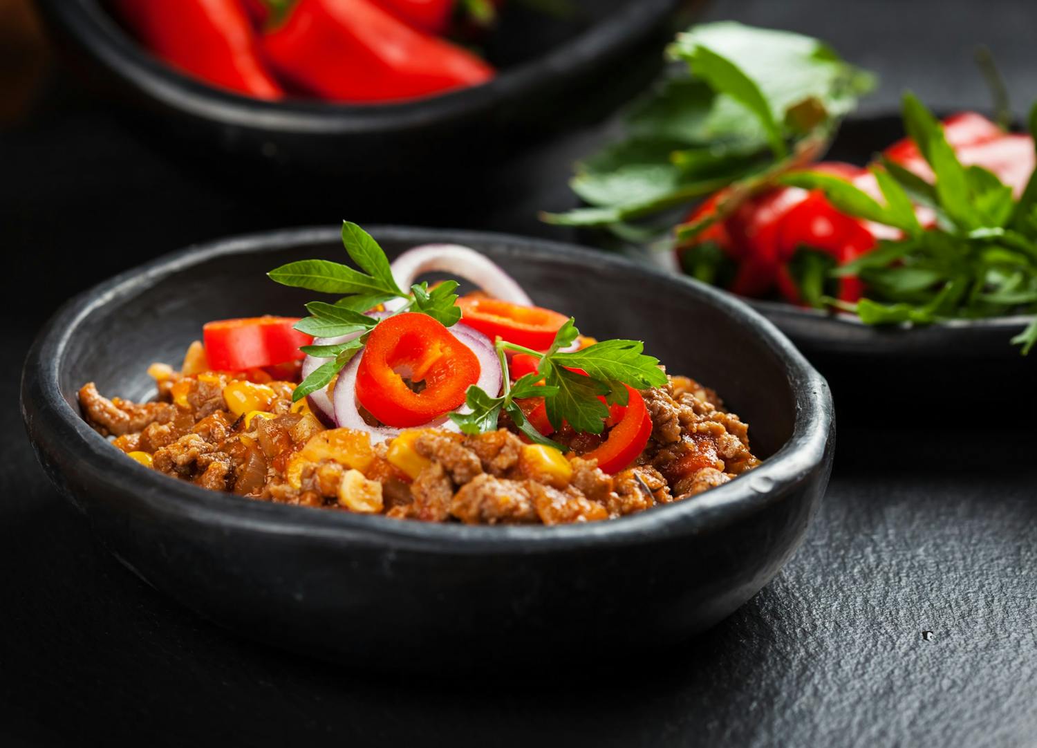 Välj ett skärpedjup som ger en fin skärpa på en del av maträtten och mjuk oskärpa i bakgrunden. För att åstadkomma en sådan effekt ska du välja en stor bländaröppning, t.ex. F2,8 i kombination med en lång brännvidd, samtidigt som du går nära inpå motivet.