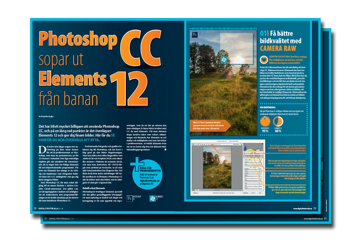 Det krävs inte längre någon stor investering på flera tusen kronor för att få proffsversionen av Photoshop, som man nu prenumererar på för 213 kronor i månaden Den låga månatliga avgiften gör det attraktivt för fotoentusiaste att ta steget från det billiga Elements till det helprofessionella programmet. För även om Elements har många av de verktyg och funktioner som fotografen behöver finns det i CC möjligheter som ger dig ännu snyggare bilder.