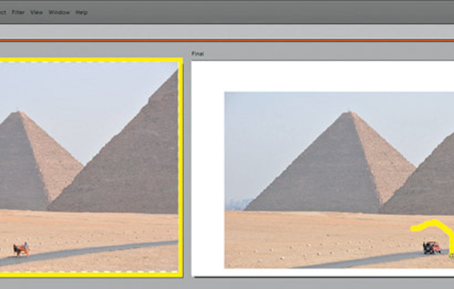 Det fungerar bra, men man måste alltså tänka på att ta två nästan identiska bilder. Men om man gör det, går det lätt att ta bort oönskade detaljer. Funktionen heter Scenrengöring och är i praktiken identisk med funktionen för redigering av gruppbilder som fanns redan i version 6, där man kunde kombinera olika bilder och skapa en bättre gruppbild utan personer som blundar.