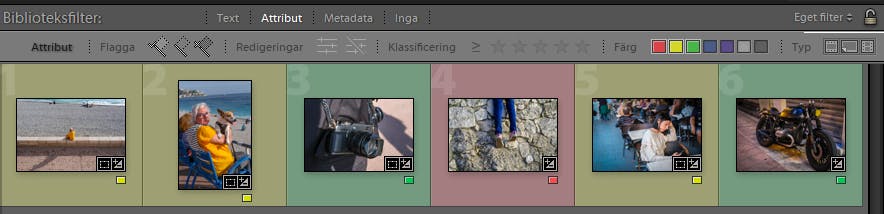 När du har valt Attribut får du en rad valmöjligheter för att sortera dina bilder. Markera t.ex. den lilla gröna rutan om du bara vill visa bilder med grön färgetikett.