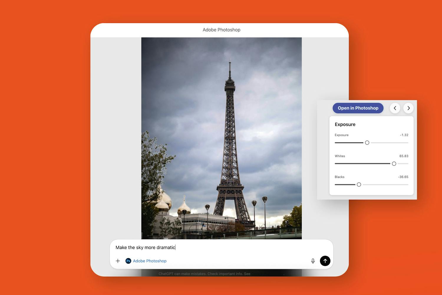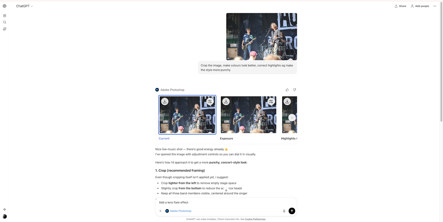 ChatGPT förklarar vad som har gjorts med bilden, låter dig finjustera redigeringen och föreslår ytterligare förbättringar. Det finns också en länk för att öppna bilden i den kostnadsfria webbaserade versionen av Photoshop så att du kan fortsätta arbeta.