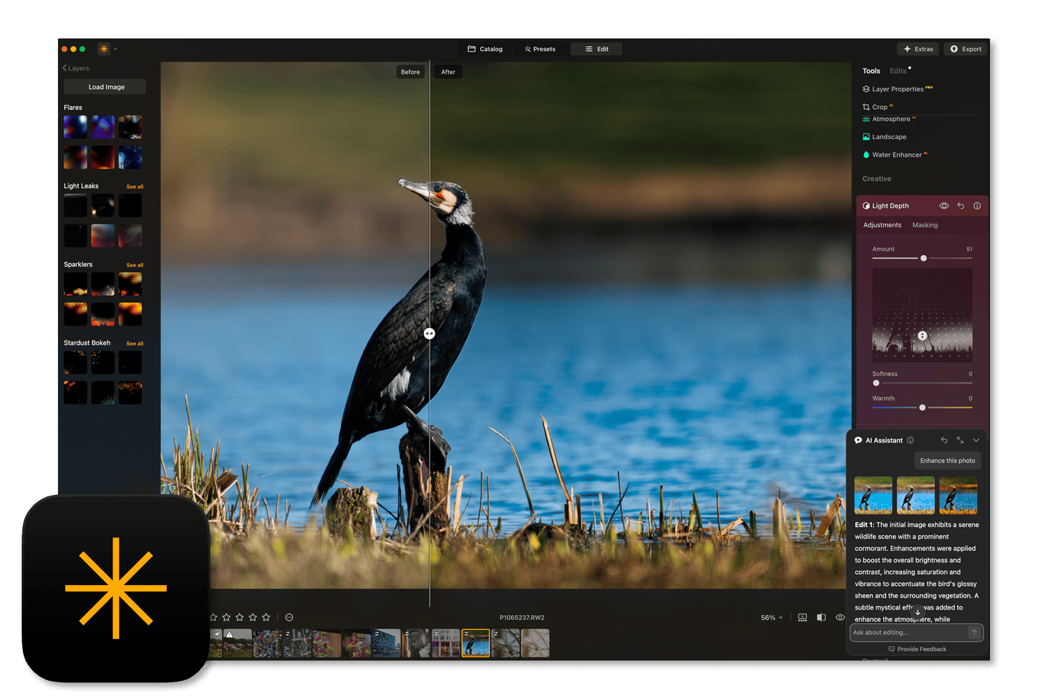 Bildredigering är en komplicerad disciplin som kan ta många år att bemästra. Få av oss förstår någonsin vad alla funktioner används till. Därför är det uppfriskande att Skylum har lagt till en AI-baserad assistent som hjälper dig att fatta rätt redigeringsbeslut. Du kan gå rakt på sak och be den förbättra din bild. Den kommer då med tre förslag på bra redigeringar. Du kan också be den förklara hur du uppnår ett specifikt mål. Sedan får du en steg-för-steg-guide som visar hur du kommer fram till målet, baserat på just din bild. På så sätt lär du dig en del på kuppen.