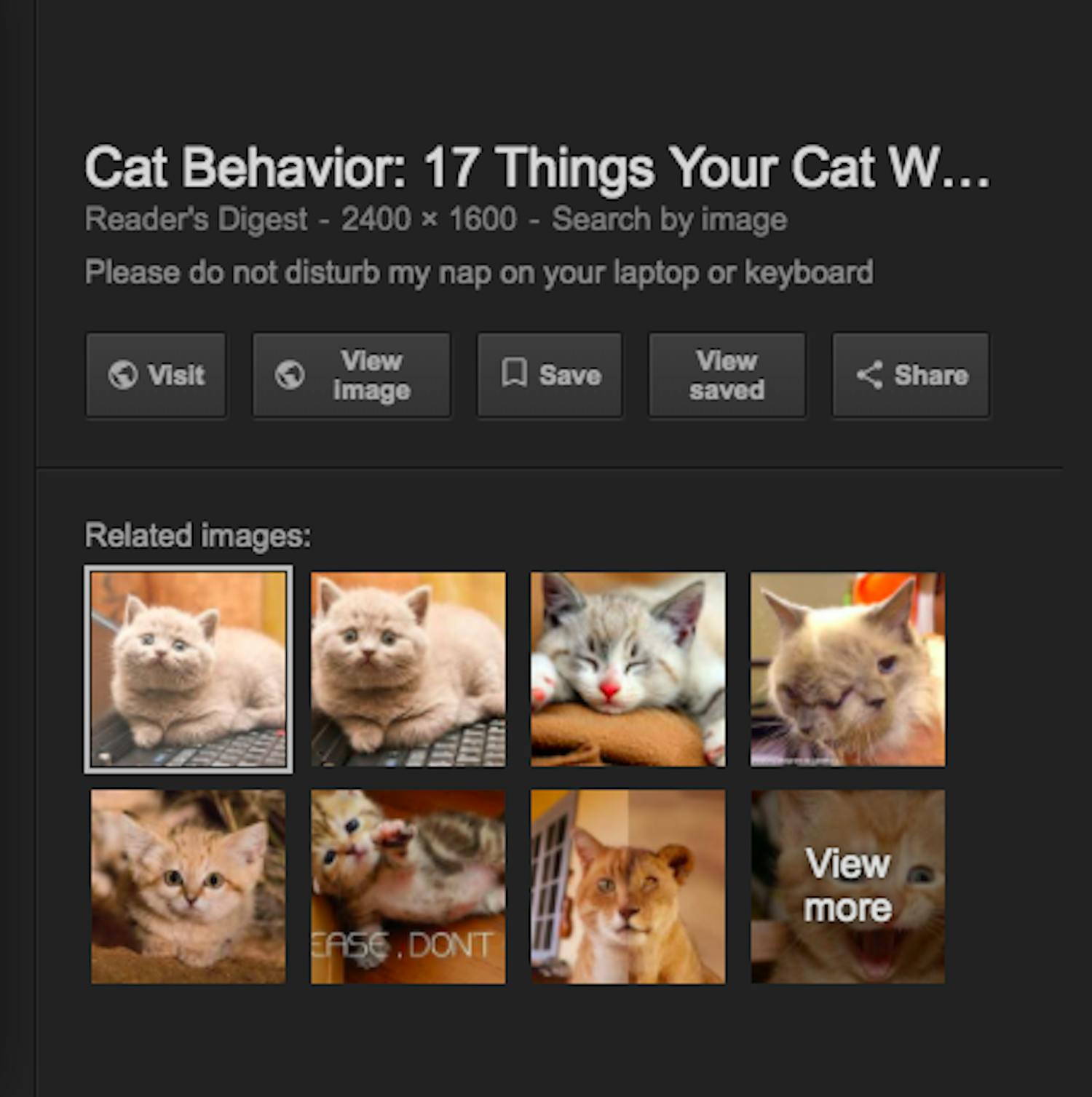 Den som efter en bildsökning vill se närmare på en bild möts nu i stället av följande val: Besök, Spara, Visa sparade och Dela.