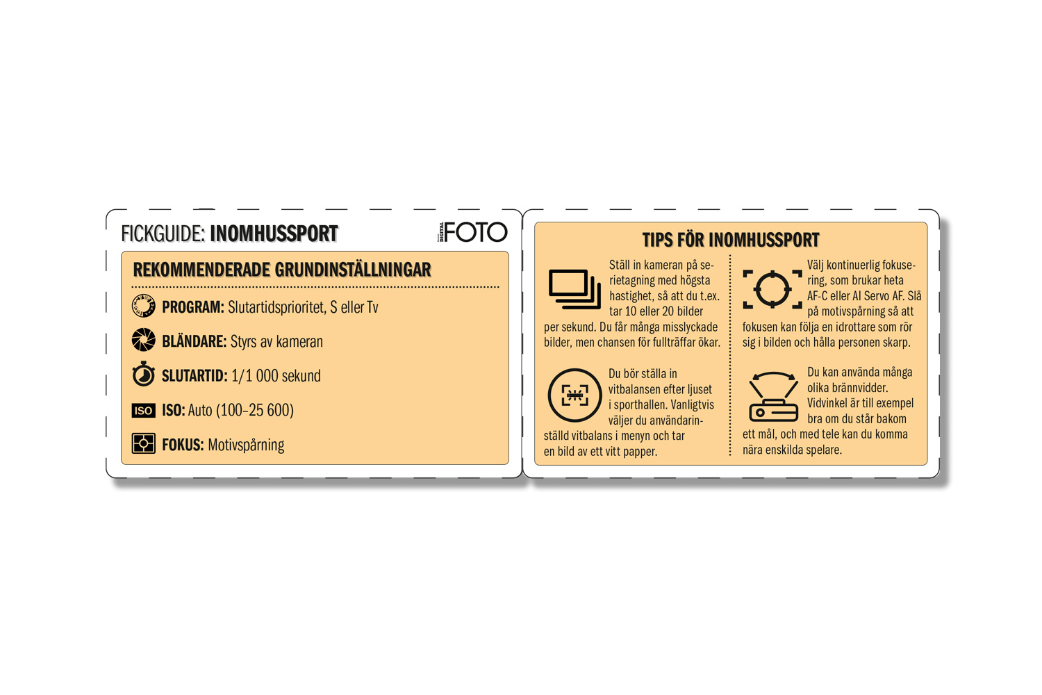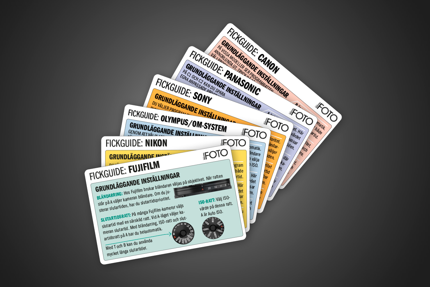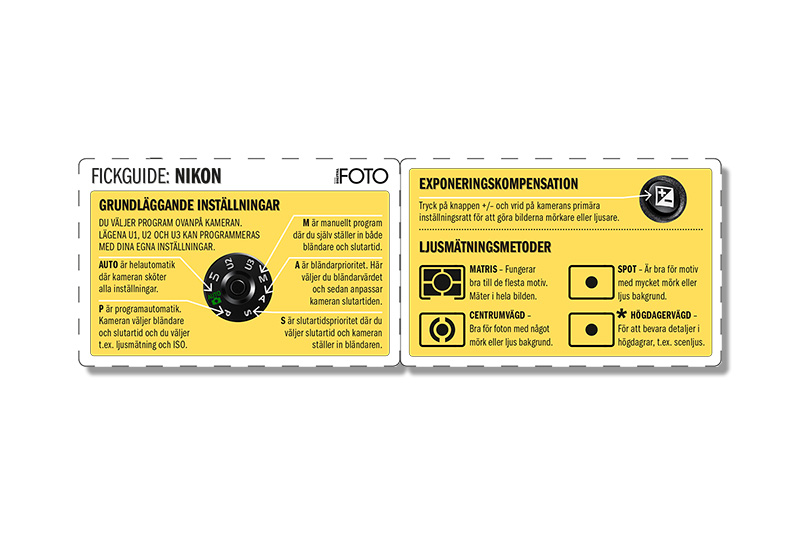 Vi har gjort en fiffig liten guide till inställning av bländare, slutartid och ljusmätning, som du alltid kan bära med dig. Guiden är i pdf-format och är enkel att skriva ut. Klipp ut, vik ihop och förvara den i fotoväskan eller plånboken, så