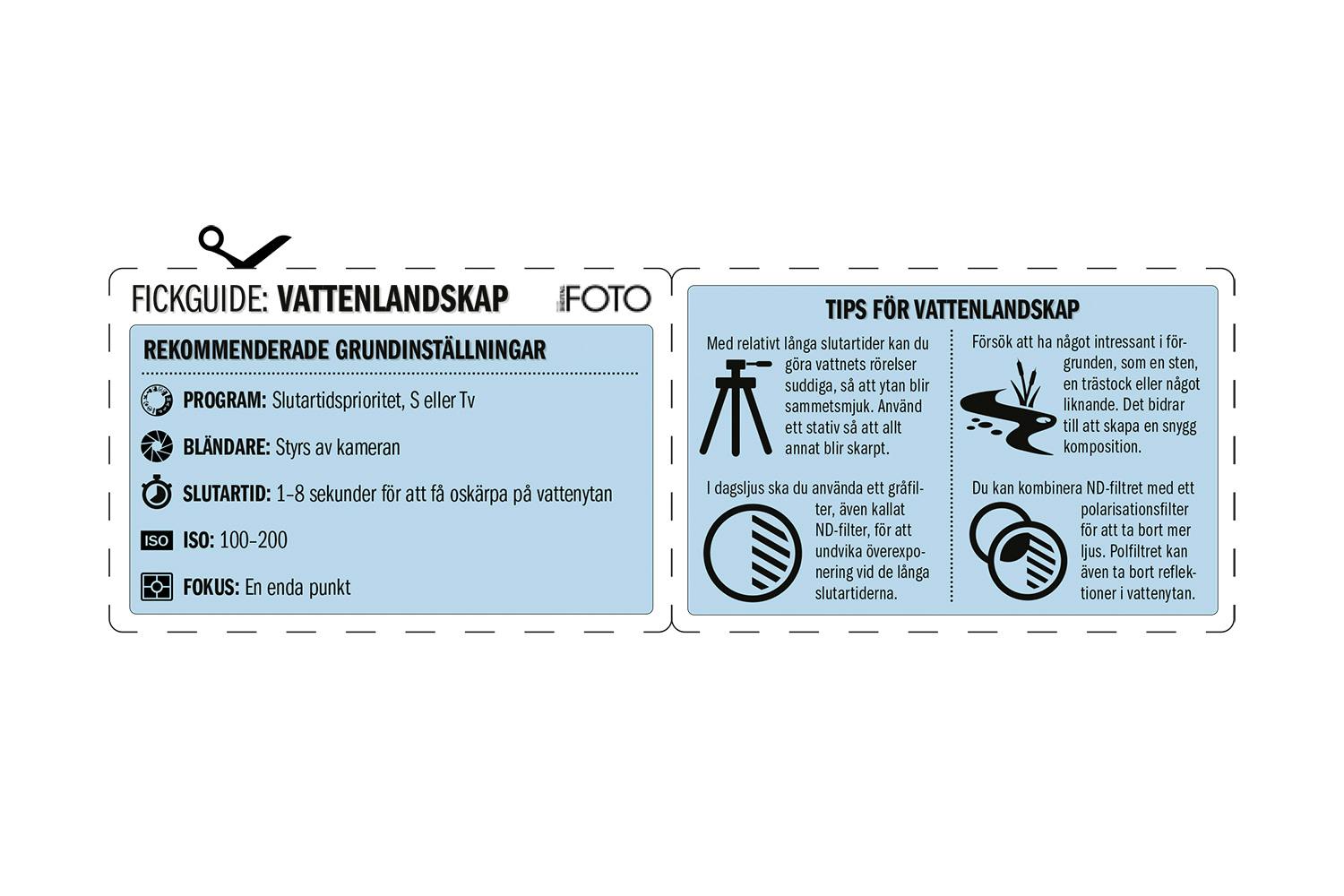Den här fickguiden innehåller bland annat tips om utrustning som hjälper dig att ta bättre bilder av vattenlandskap. Du får även våra rekommenderade inställningar.