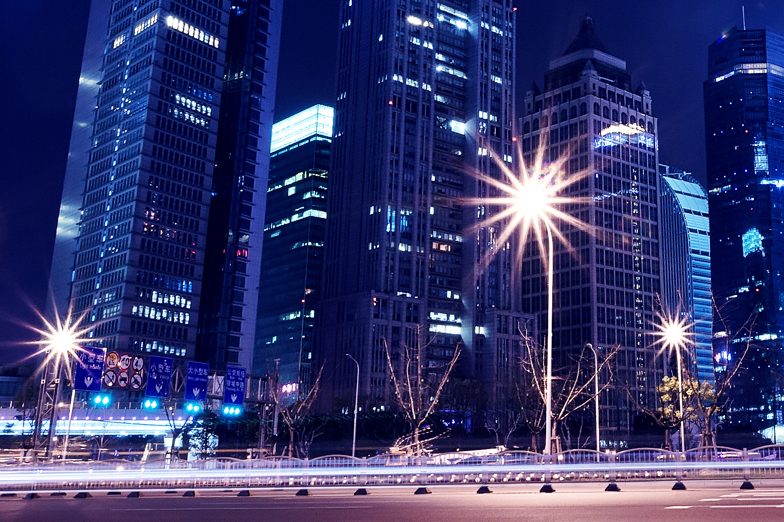 Kontrasterna mellan den mörka himlen och stadens artificiella ljus är stora. Det betyder att både de ljusa och de mörka delarna av bilden kan bli utan detaljer.