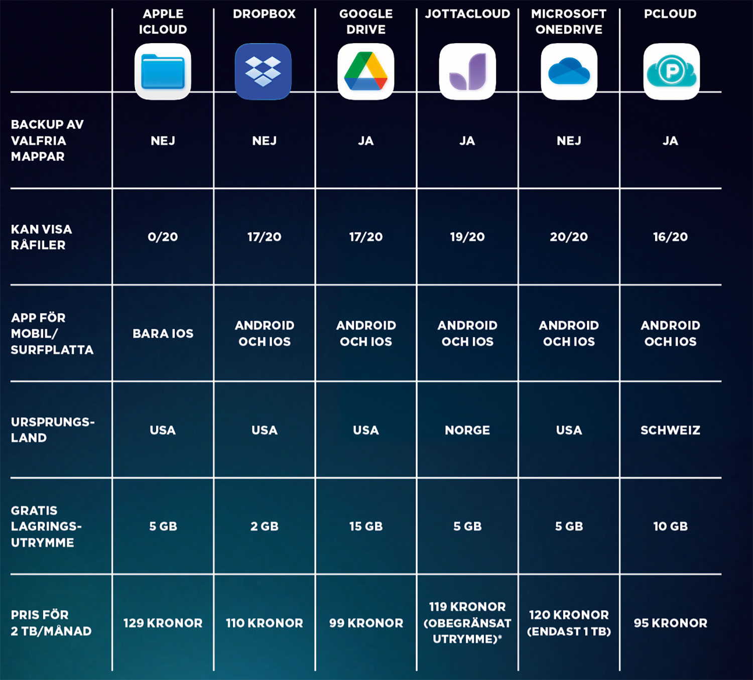 Här följer en översikt över några av de mest använda molnlagringstjänsterna. Du kan prova alla gratis, och priserna anges i tabellen. Du ser även om tjänsten kan visa bilder i råformat. Vi laddade upp 20 råfiler från 20 kameror till varje tjänst och kollade hur många av bilderna som tjänsten kunde visa på webbplatsen.