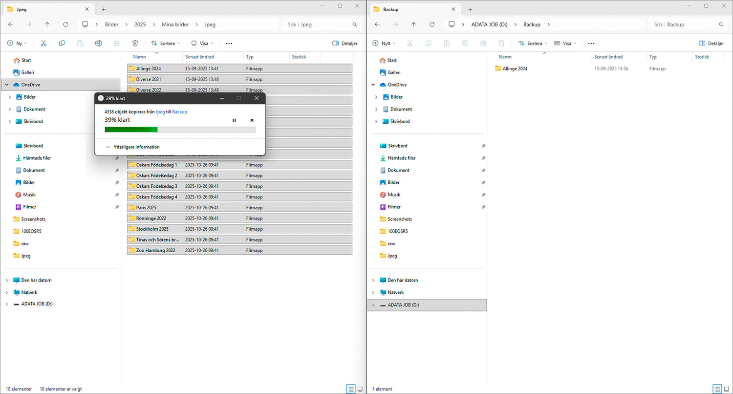 När du ska kopiera dina bilder till hårddisken kan du överföra dem via Utforskaren i Windows eller Finder i MacOS, där du drar mappar eller filer från datorn till den externa hårddisken. Du behöver alltså själv kopiera filerna varje gång. Om du redigerar en bild måste du komma ihåg att kopiera den till din backup.
