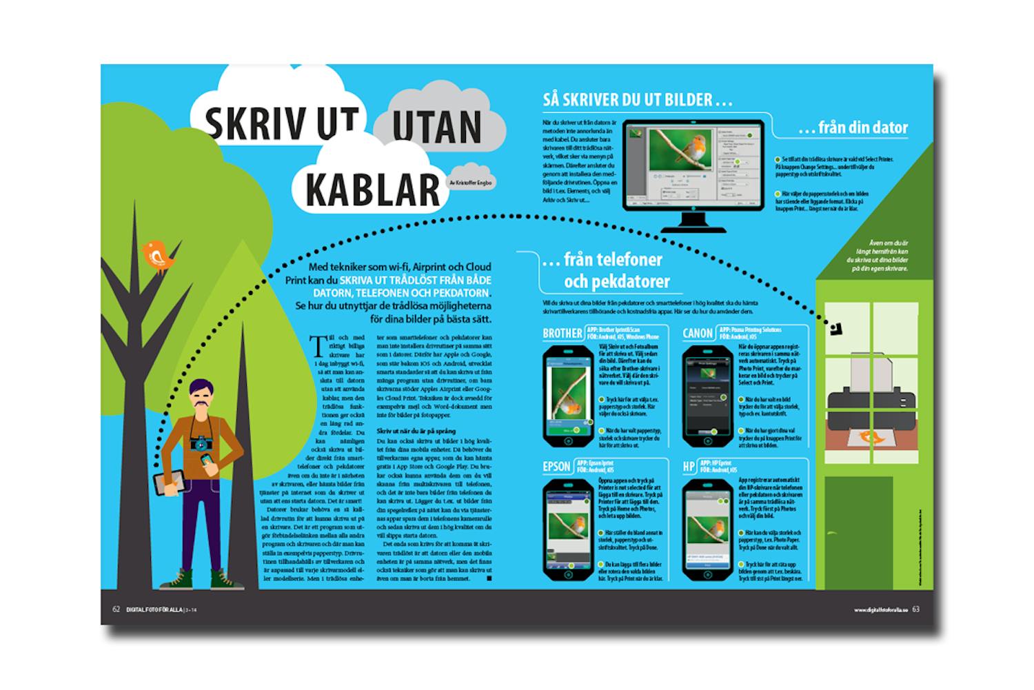 Till och med riktigt billiga skrivare har i dag inbyggt wi-fi, så att man kan ansluta till datorn utan att använda kablar, men den trådlösa funktionen ger också en lång rad andra fördelar. Du kan nämligen också skriva ut bilder direkt från smarttelefoner och pekdatorer även om du inte är i närheten av skrivaren, eller hämta bilder från tjänster på internet som du skriver ut utan att ens starta datorn. Det är smart!