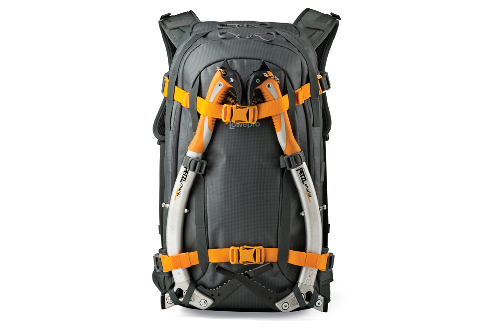 Väskorna har vattentäta material i botten och ett inbyggt överdrag som skyddar mot snö, regn och sand. Man kommer åt kamerautrustningen från ryggen, och på framsidan sitter en stor ficka för andra prylar. Dessutom kan man fästa diverse utrustning på utsidan, t.ex. isyxa eller skidor.