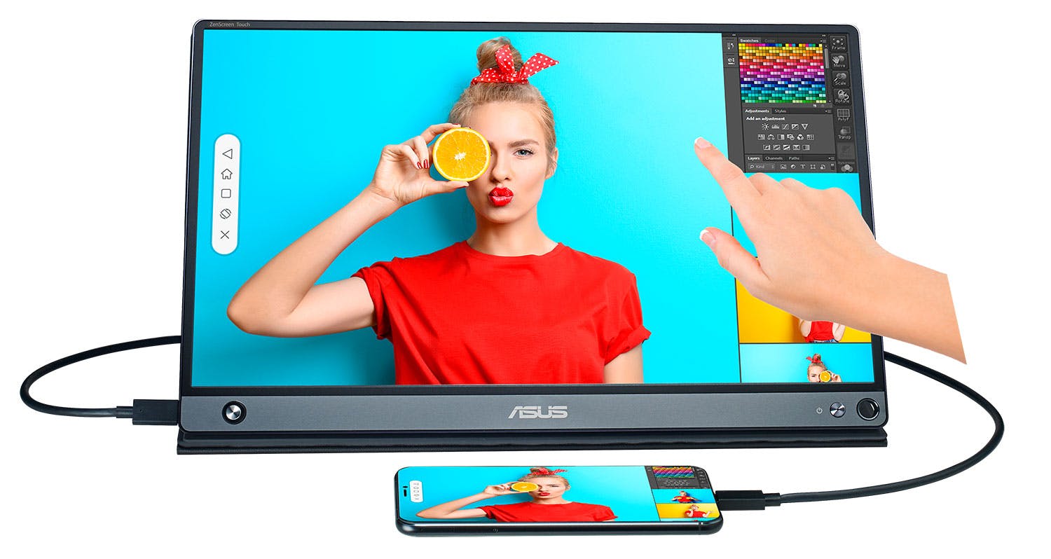 Skärmen har batteri och högtalare och ansluts till andra enheter via USB-C eller HDMI. Det fungerar bra med en bärbar dator, där man till exempel kan lägga Lightrooms menyer med mera på den ena skärmen och bilden på den andra. Skärmens touch-funktion gör att man kan trycka för att bland annat zooma i en bild.