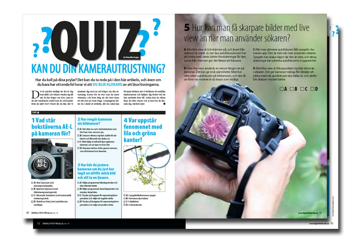 Det är bara ett fåtal som kan varenda vrå av menysystemet och som kan bli väckta mitt i natten och redogöra för samtliga funktioner i kameran. I detta quiz kan du kolla hur bra eller dålig koll du har på din kamerautrustning. Vi ställer en rad frågor med fyra svarsalternativ, men det är bara ett som är rätt. Till sist kan du läsa de rätta svaren och förklaringarna bakom.