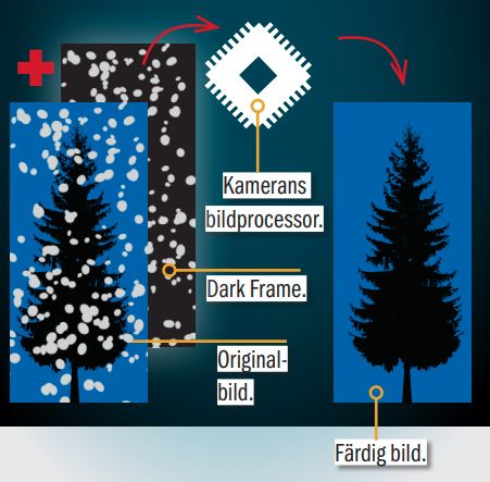 Efter exponeringen gör kameran ännu en exponering utan att öppna slutaren. Bild nummer två blir helt svart. Med hjälp av den kan processorn registrera bruset som uppstår i bildsensorn. Bildbruset som registreras eliminerar processorn sedan från bild nummer ett. Därefter genomgår bilden den vanliga brusreduceringen, och resultatet blir en betydligt renare bild.