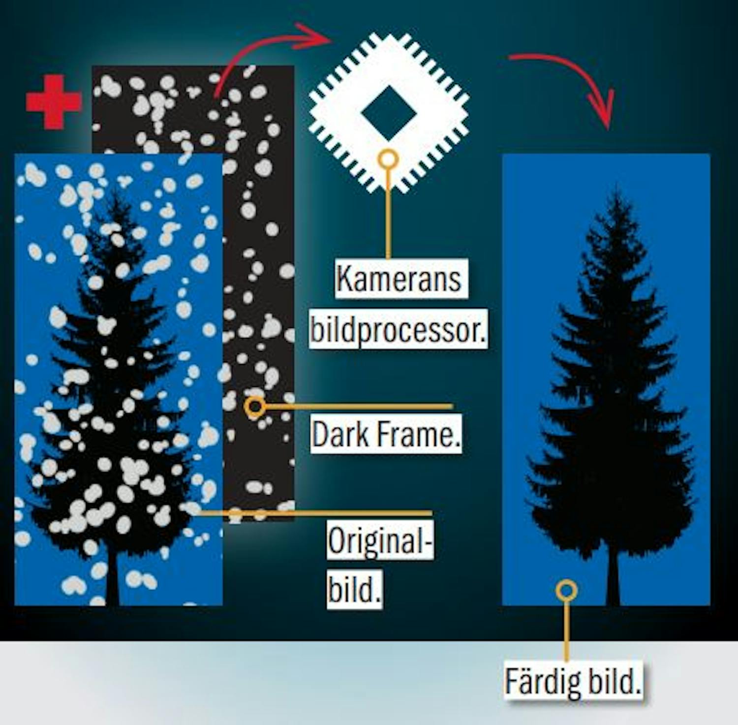 Allt är som det ska. Tiden som går efter att du har gjort en lång exponering använder DSLR-kameran till att reducera bildbruset, och det är ett kvalitetstecken att du hör två klick från slutaren vid långa exponeringar. Det betyder att kameran använder en avancerad typ av brusreducering som heter Dark Frame Subtraction. Funktionen finns i alla moderna DSLR-kameror. På illustrationerna nedan ser du hur brusreduceringen fungerar. Du ska även veta att brusreduceringen kan stängas av vid långa exponeringar i de flesta avancerade kameror, men det ska du bara göra om du vill spara på batteriet eller om du fotograferar i råformat och tar bort bruset vid råkonverteringen.