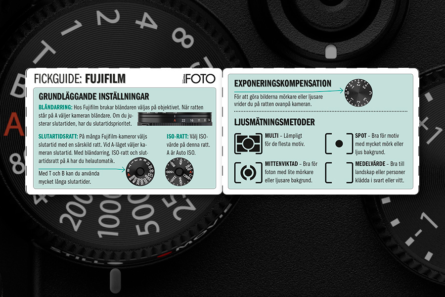 Här får du en praktisk fickguide med de viktigaste inställningarna av bland annat tagningsprogram och ljusmätning i kameror från Fujifilm.