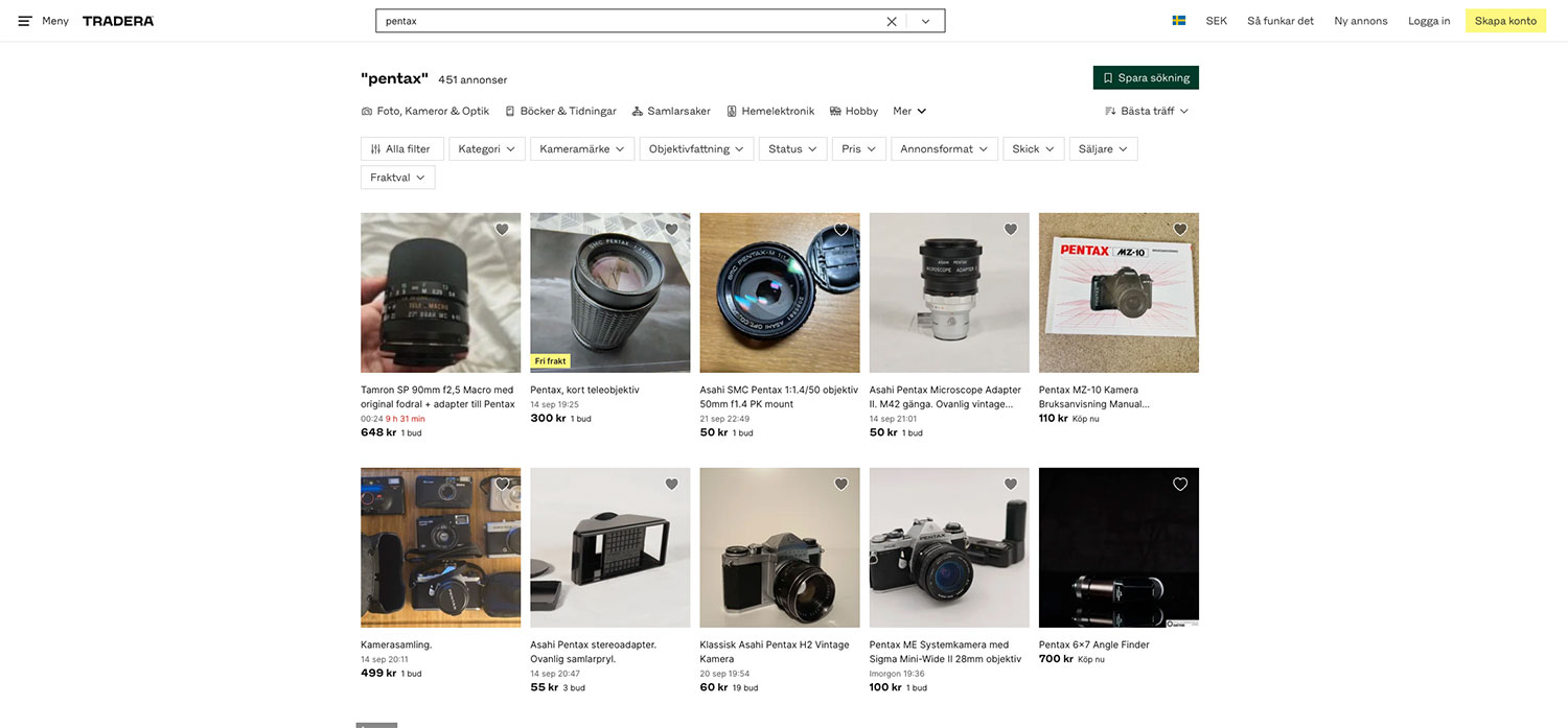 Många kameror på begagnatsajter på nätet säljs i befintligt skick, utan att säljaren vet om de fungerar med film i. Därför är det ofta ett vågspel när jag bjuder. Om utrustningen inte fungerar när paketet kommer fram är det en tråkig överraskning, såvida inte säljaren har skrivit att den fungerar. Det har hänt att jag har kasserat kameror och objektiv som visat sig vara defekta.